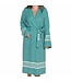 Hoewel de badjas op de foto gedragen wordt door een vrouw is dit model geschikt als dames én heren badjas. Het unisex model is verkrijgbaar in zes maten en nog 9 andere kleuren.
